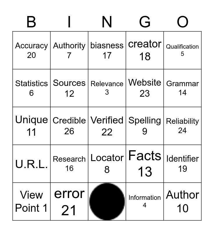 This bingo card has 1 images and 27 words: View Point 1, Up-to-date 2, Relevance 3, Information 4, Qualification 5, Statistics 6, Authority 7, Locator 8, Spelling 9, Author 10, Unique 11, Sources 12, Facts 13, Grammar 14, Currency 15, Research 16, biasness 17, creator 18, Identifier 19, Accuracy 20, error 21, Verified 22, Website 23, Reliability 24, U.R.L., Credible 26 and Revised 27.