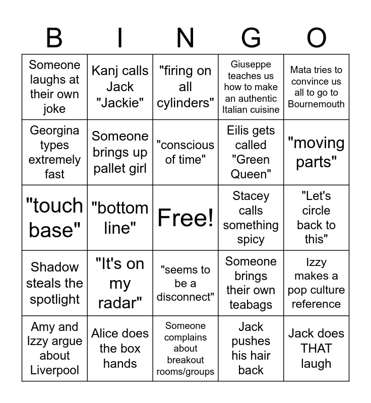 This bingo card has a free space and 24 words: "It's on my radar", Alice does the box hands, "conscious of time", Amy and Izzy argue about Liverpool, Mata tries to convince us all to go to Bournemouth, Someone laughs at their own joke, Georgina types extremely fast, Kanj calls Jack "Jackie", Stacey calls something spicy, "seems to be a disconnect", Eilis gets called "Green Queen", "touch base", Someone brings their own teabags, Izzy makes a pop culture reference, Someone brings up pallet girl, Jack pushes his hair back, "Let's circle back to this", "firing on all cylinders", "moving parts", "bottom line", Jack does THAT laugh, Shadow steals the spotlight, Giuseppe teaches us how to make an authentic Italian cuisine and Someone complains about breakout rooms/groups.