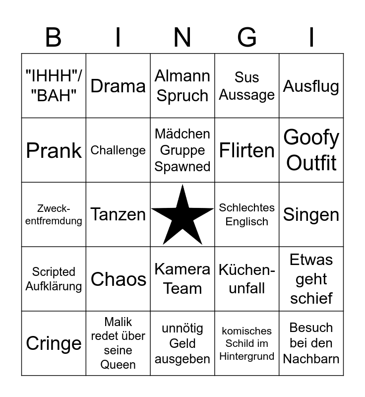 This bingo card has a free space and 24 words: Chaos, Malik redet über seine Queen, Mädchen Gruppe Spawned, Cringe, Ausflug, "IHHH"/ "BAH", Prank, Drama, Schlechtes Englisch, Kamera Team, Flirten, Zweck-entfremdung, Küchen- unfall, Etwas geht schief, Challenge, komisches Schild im Hintergrund, Singen, Almann Spruch, Goofy Outfit, Tanzen, Besuch bei den Nachbarn, Scripted Aufklärung, Sus Aussage and unnötig Geld ausgeben.