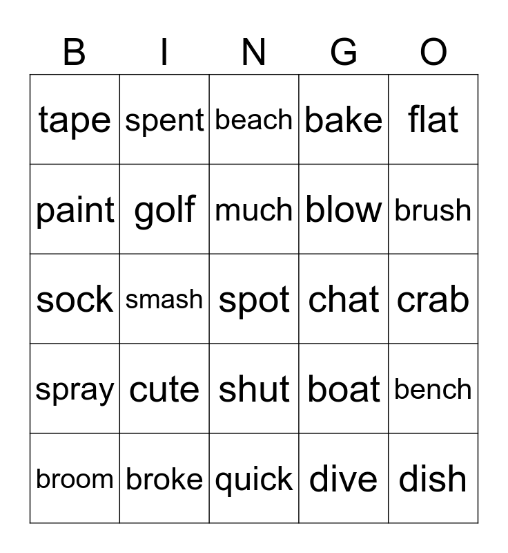 This bingo card has a free space and 24 words: cute, broke, much, broom, flat, tape, paint, spent, chat, shut, blow, sock, boat, bench, golf, dive, crab, beach, brush, smash, dish, spray, bake and quick.