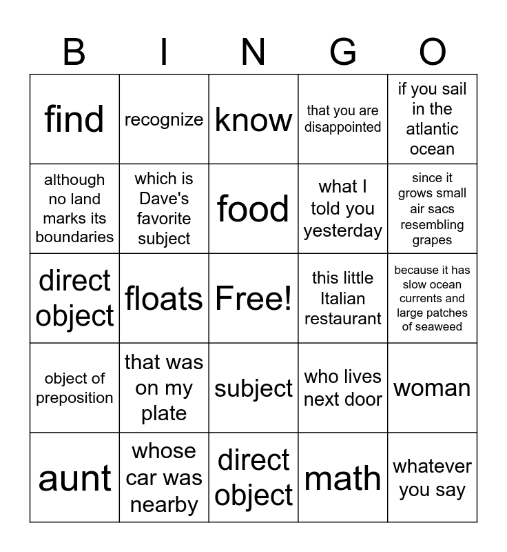This bingo card has a free space and 24 words: that was on my plate, whose car was nearby, food, aunt, if you sail in the atlantic ocean, find, although no land marks its boundaries, recognize, this little Italian restaurant, subject, what I told you yesterday, direct object, who lives next door, woman, which is Dave's favorite subject, math, because it has slow ocean currents and large patches of seaweed, know, since it grows small air sacs resembling grapes, floats, whatever you say, object of preposition, that you are disappointed and direct object.