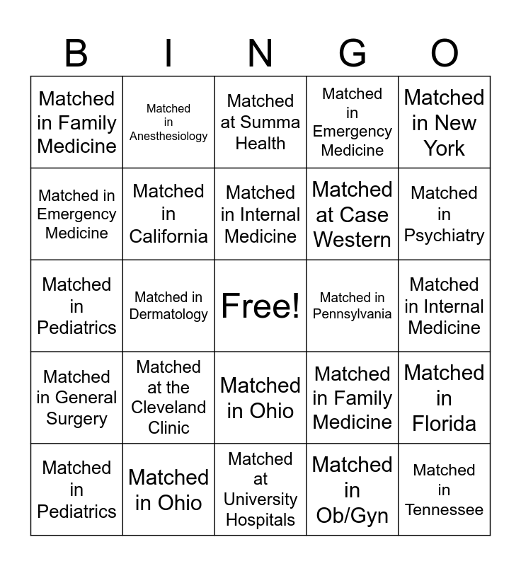 This bingo card has a free space and 24 words: Matched at the Cleveland Clinic, Matched in Ohio, Matched in Internal Medicine, Matched in Pediatrics, Matched in New York, Matched in Family Medicine, Matched in Emergency Medicine, Matched in Anesthesiology, Matched in Pennsylvania, Matched in Ohio, Matched at Case Western, Matched in Pediatrics, Matched in Family Medicine, Matched in Florida, Matched in California, Matched in Ob/Gyn, Matched in Internal Medicine, Matched at Summa Health, Matched in Psychiatry, Matched in Dermatology, Matched in Tennessee, Matched in General Surgery, Matched in Emergency Medicine and Matched at University Hospitals.