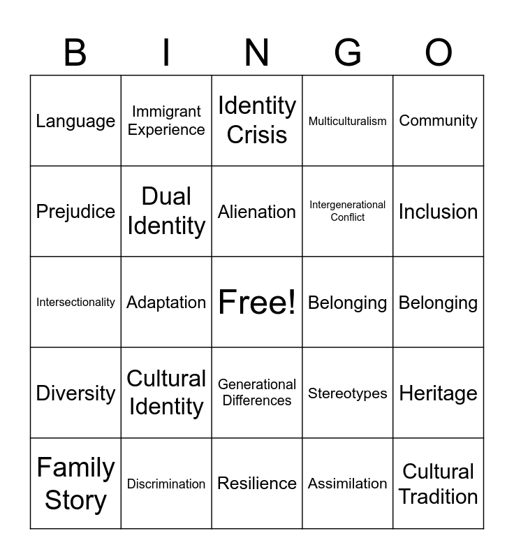 This bingo card has a free space and 45 words: Immigrant Experience, Cultural Tradition, Language, Family Story, Diversity, Assimilation, Identity Crisis, Heritage, Community, Discrimination, Multiculturalism, Belonging, Generational Differences, Cultural Identity, Integration, Resilience, Prejudice, Intersectionality, Adaptation, Inclusion, Immigrant Experience, Family Story, Cultural Tradition, Language, Identity Crisis, Belonging, Generational Gap, Cultural Assimilation, Stereotypes, Diversity, Intersectionality, Heritage, Discrimination, Resilience, Community, Adaptation, Acceptance, Multiculturalism, Patriotism, Alienation, Prejudice, Intergenerational Conflict, Assimilation Struggles, Dual Identity and Empowerment.