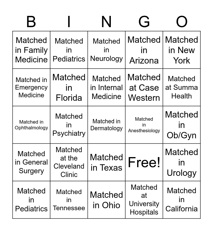 This bingo card has 25 words: Matched at the Cleveland Clinic, Matched in Ohio, Matched in Internal Medicine, Matched in Pediatrics, Matched in New York, Matched in Family Medicine, Matched in Emergency Medicine, Matched in Pediatrics, Matched in Anesthesiology, Matched in Texas, Matched at Case Western, Matched in Ophthalmology, Free!, Matched in Urology, Matched in Florida, Matched in California, Matched in Ob/Gyn, Matched in Neurology, Matched at Summa Health, Matched in Psychiatry, Matched in Dermatology, Matched in Tennessee, Matched in General Surgery, Matched in Arizona and Matched at University Hospitals.