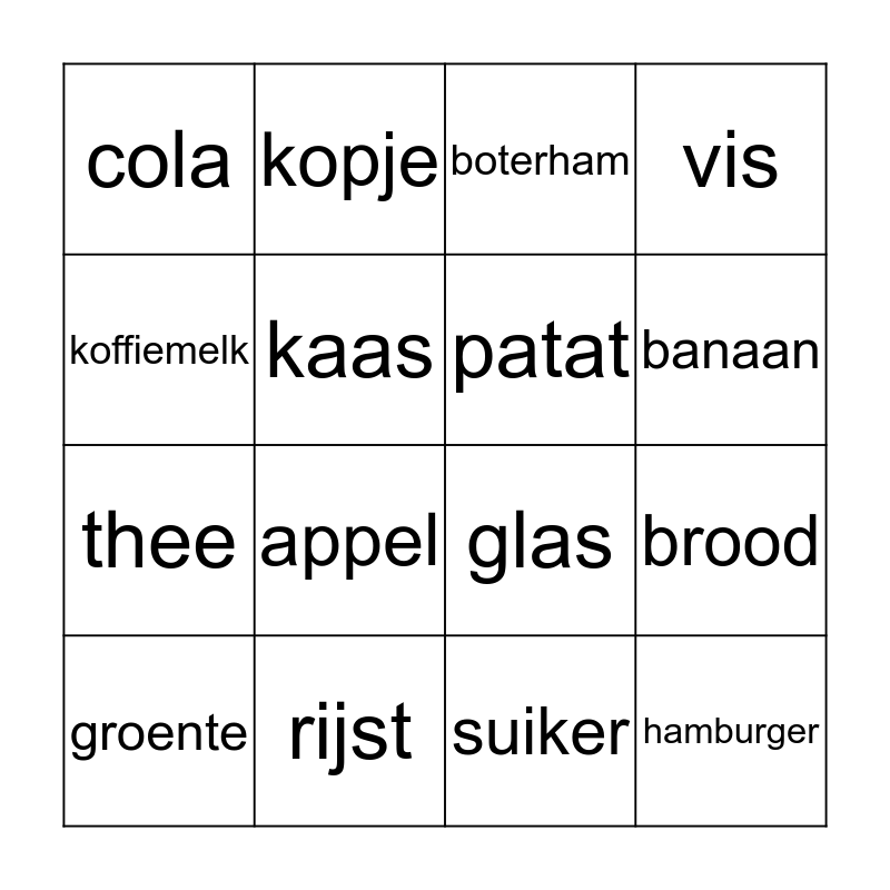 This bingo card has 16 words: rijst, brood, boterham, cola, thee, kopje, glas, suiker, koffiemelk, kaas, groente, vis, appel, banaan, patat and hamburger.
