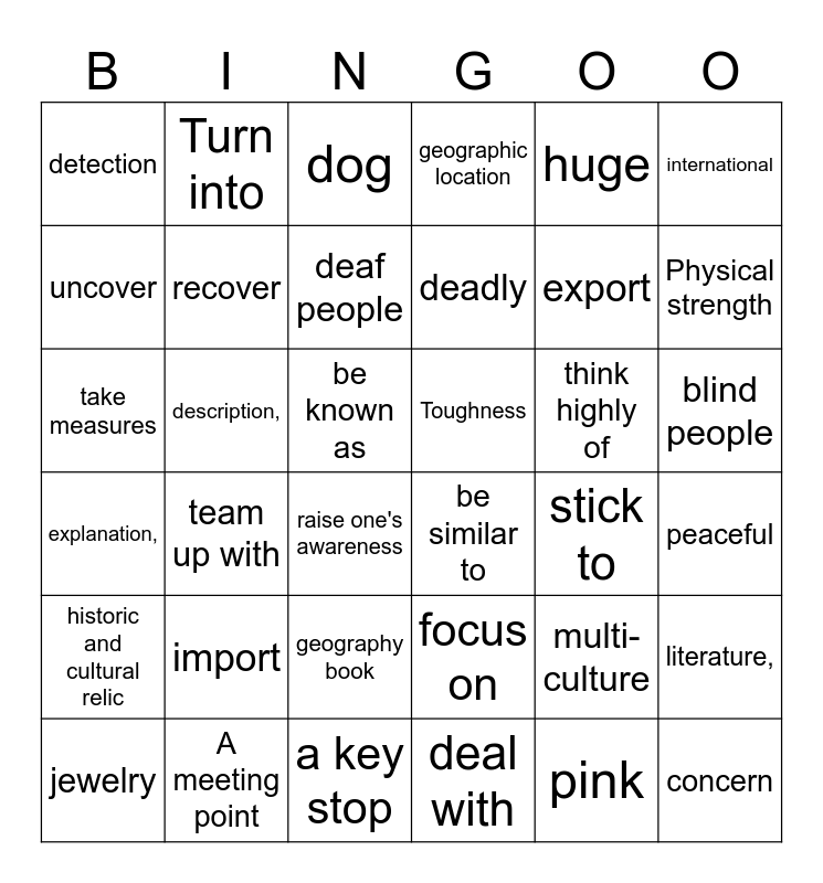 This bingo card has 69 words: Peaceful, be known as, unusual, deal with, be similar to, It is closer in appearance, geographic location, Possibility, huge, endangered animals, team up with, disabilities, detection, dog, mental strength, Physical strength, blind people, deaf people, act as, Toughness, description,, explanation,, deadly, geography book, literature,, science fiction, Stressful, Option, peaceful, similarly, Turn into, Come across, make up, spread the joy, a key stop, A meeting point, further educate, multi-culture, international, historic and cultural relic, think highly of, take measures, focus on, pay attention to, promote traditional culture, raise one's awareness, pink, grey, weaken, uncover, recover, grandly, jewelry, stick to, put one’s heart into, suddenly, optimistic, productive, import, export, strengthen, deepen, enlarge, concern, preserve, reserve, a copy of, increase knowledge and future generations.