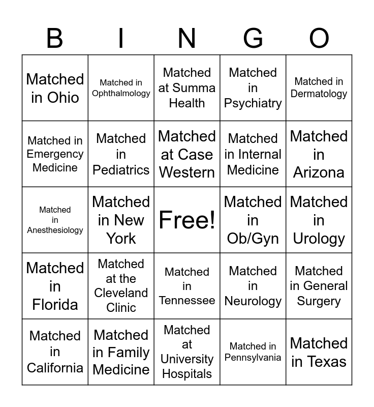 This bingo card has a free space and 24 words: Matched at the Cleveland Clinic, Matched in Family Medicine, Matched at Case Western, Matched in California, Matched in Dermatology, Matched in Ohio, Matched in Emergency Medicine, Matched in Ophthalmology, Matched in Ob/Gyn, Matched in Tennessee, Matched in Internal Medicine, Matched in Anesthesiology, Matched in Neurology, Matched in General Surgery, Matched in Pediatrics, Matched in Pennsylvania, Matched in Urology, Matched at Summa Health, Matched in Arizona, Matched in New York, Matched in Texas, Matched in Florida, Matched in Psychiatry and Matched at University Hospitals.