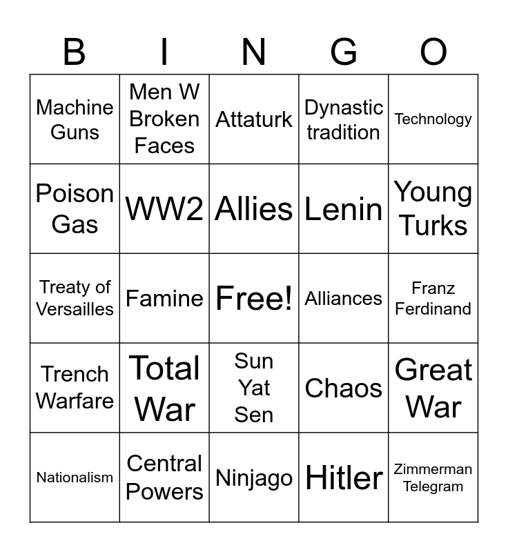 This bingo card has a free space and 24 words: Total War, Central Powers, Allies, Nationalism, Technology, Machine Guns, Poison Gas, Men W Broken Faces, Alliances, Sun Yat Sen, Lenin, Treaty of Versailles, Chaos, Great War, WW2, Hitler, Franz Ferdinand, Attaturk, Young Turks, Famine, Zimmerman Telegram, Trench Warfare, Dynastic tradition and Ninjago.