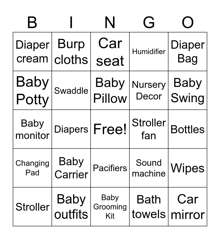 This bingo card has a free space and 29 words: Stroller, Baby Bouncer, Diapers, Wipe Warmer, Diaper cream, Car seat, Swaddle, Baby Carrier, Stroller fan, Baby outfits, Bottles, Car mirror, Baby Grooming Kit, Bath towels, Baby Swing, Wash cloths, Pacifiers, Changing Pad, Diaper Bag, Baby monitor, Sound machine, Bassinet, Nursery Decor, Baby Potty, Humidifier, Burp cloths, Wipes, Baby Pillow and Bed Sheets.