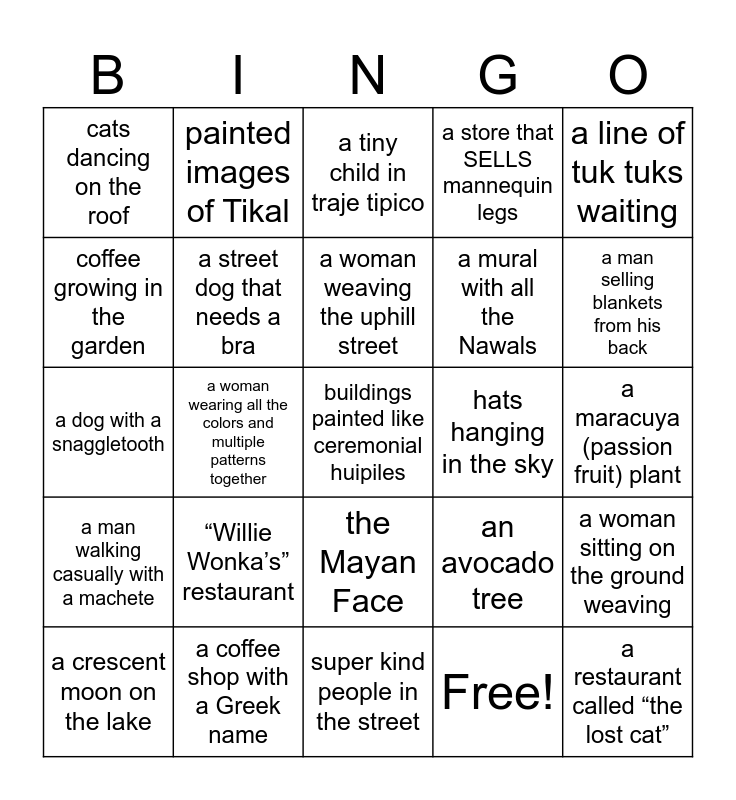 This bingo card has a free space and 32 words: Free!, a chicken on the run, a woman wearing all the colors and multiple patterns together, a woman walking with a basket of masa on her head, a man walking casually with a machete, a street dog that needs a bra, a line of tuk tuks waiting, a woman sitting on the ground weaving, painted images of Tikal, John the Baptist as a fountain, a woman weaving the uphill street, a tiny child in traje tipico, creative coffee art, Barack Obama in a mask, hats hanging in the sky, hammocks in the water, a crescent moon on the lake, a dog with a snaggletooth, the Mayan Face, “Willie Wonka’s” restaurant, an avocado tree, a pomegranate tree, a maracuya (passion fruit) plant, a coffee shop with a Greek name, a restaurant called “the lost cat”, a store that SELLS mannequin legs, a mural with all the Nawals, coffee growing in the garden, cats dancing on the roof, super kind people in the street, fresh meat or fish sold on street corners and a man selling blankets from his back.