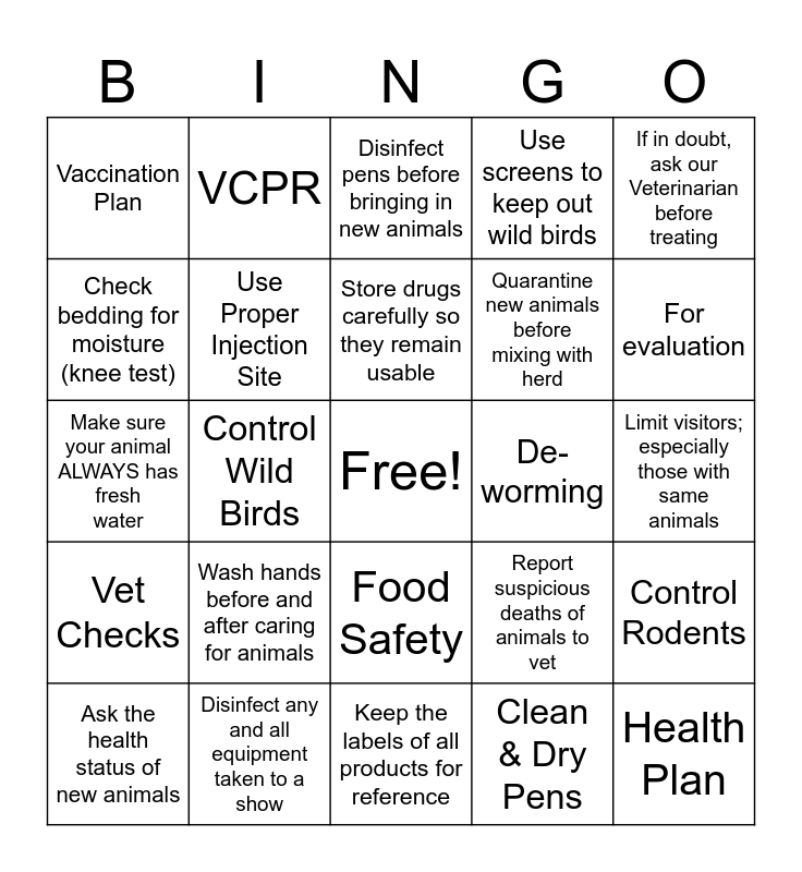 This bingo card has a free space and 30 words: Ask the health status of new animals, Keep your treatment record up to date, Store drugs carefully so they remain usable, Bleach is an effective disinfectant, If in doubt, ask our Veterinarian before treating, Vaccination Plan, VCPR, Food Safety, De-worming, Health Plan, Vet Checks, Use Proper Injection Site, Identify your animals accurately, Clean & Dry Pens, Control Rodents, Control Wildlife, Control Wild Birds, Keep the labels of all products for reference, Report suspicious deaths of animals to vet, For evaluation, Make sure your animal ALWAYS has fresh water, Disinfect any and all equipment taken to a show, Disinfect pens before bringing in new animals, Quarantine new animals before mixing with herd, Limit visitors; especially those with same animals, Check bedding for moisture (knee test), Wash hands before and after caring for animals, Only use products labeled for animals on your animal, Use screens to keep out wild birds and Thoroughly clean truck or trailer between hauling.