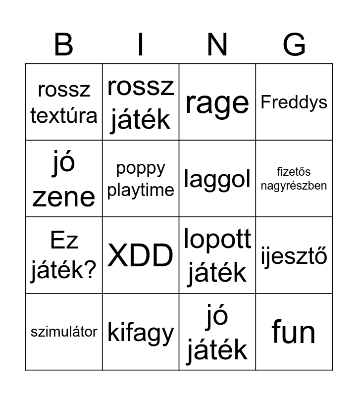This bingo card has 16 words: szimulátor, kifagy, rage, Freddys, jó zene, rossz játék, lopott játék, ijesztő, rossz textúra, poppy playtime, jó játék, fizetős nagyrészben, Ez játék?, XDD, laggol and fun.