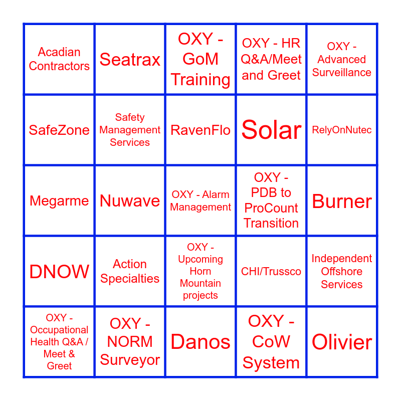 This bingo card has 45 words: OXY - Production Enhancement, OXY - Alarm Management, OXY - SAP, OXY - Occupational Health Q&A / Meet & Greet, OXY - SEMS/Info Management, OXY - CoW System, OXY - GoM Training, OXY - MP Bacteria Study, OXY - Advanced Surveillance, OXY - NORM Surveyor, OXY - HR Q&A/Meet and Greet, OXY - PDB to ProCount Transition, OXY - Upcoming Horn Mountain projects, Action Specialties, Altrad-Sparrows, Danos, FSS, Megarme, QPS (Quality Process Services), RelyOnNutec, Seatrax, Trinity Rentals Services, Abyss, Acadian Contractors, Bristow, Burner, Cajun Cutters, Champion X, CHI/Trussco, DNOW, Gulf Island Services, Independent Offshore Services, ISN, Louisiana Cat, Numeric Engineering, Nuwave, OAR Specialized Services, Oceaneering, Olivier, RavenFlo, SafeZone, Solar, Siron, Safety Management Services and Veris Global.