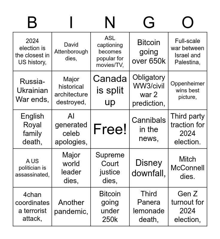 This bingo card has a free space and 24 words: Major world leader dies,, Another pandemic,, Canada is split up, 4chan coordinates a terrorist attack,, Full-scale war between Israel and Palestina,, 2024 election is the closest in US history,, Russia-Ukrainian War ends,, David Attenborough dies,, Cannibals in the news,, Supreme Court justice dies,, Obligatory WW3/civil war 2 prediction,, English Royal family death,, Disney downfall,, Mitch McConnell dies., Major historical architecture destroyed,, Third Panera lemonade death,, Third party traction for 2024 election., ASL captioning becomes popular for movies/TV,, Oppenheimer wins best picture,, AI generated celeb apologies,, Gen Z turnout for 2024 election,, A US politician is assassinated,, Bitcoin going over 650k and Bitcoin going under 250k.