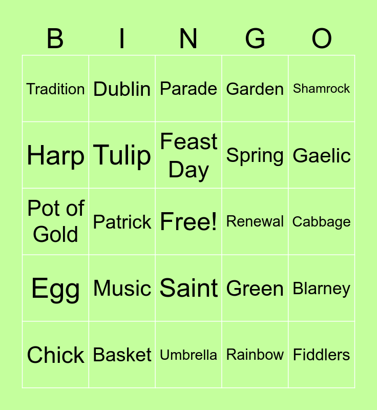This bingo card has a free space and 42 words: Apostle, Feast Day, Ireland, Music, Rainbow, Blarney, Fiddlers, Irish, Parade, Saint, Cabbage, Gaelic, Patrick, Shamrock, Corned Beef, Green, Luck, Pot of Gold, Step Dancing, Dublin, Harp, March, Potato, Tradition, April, Showers, Spring, Easter, Blossom, Rain, Bunny, Egg, Tulip, Umbrella, Butterfly, Chick, Basket, Renewal, Sunshine, Pastel, Garden and Earth Day.