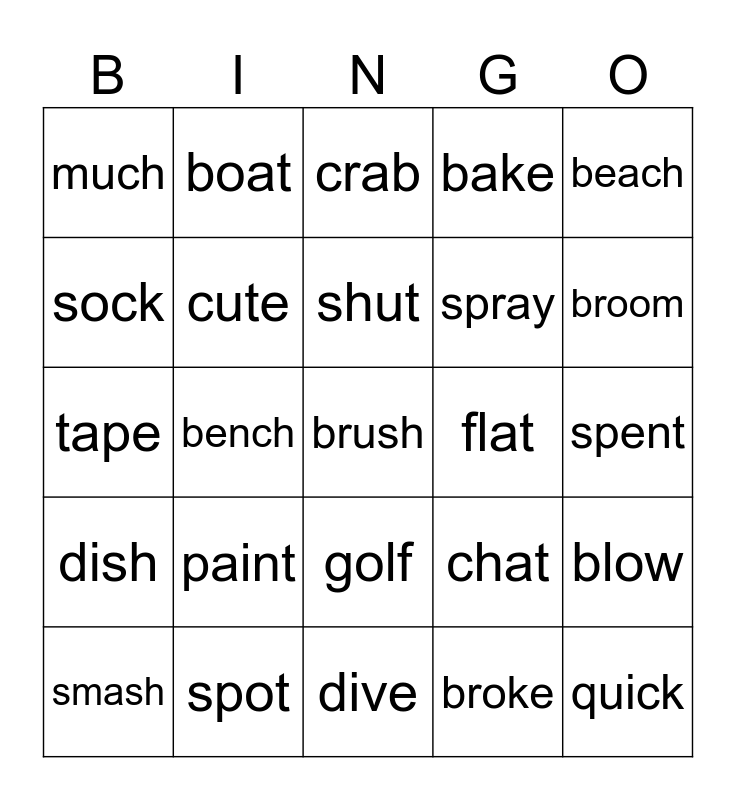 This bingo card has a free space and 24 words: paint, spot, shut, smash, beach, much, sock, boat, flat, golf, spray, tape, chat, blow, cute, broke, spent, crab, broom, bench, quick, dish, bake and dive.