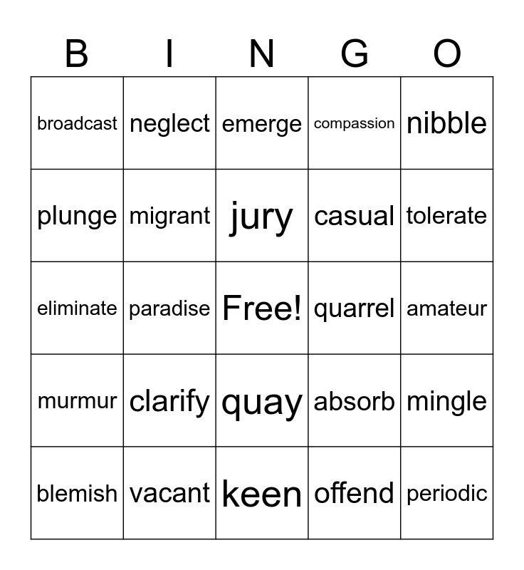 This bingo card has a free space and 27 words: absorb, bedraggled, casual, keen, plunge, emerge, neglect, murmur, quarrel, mingle, eliminate, compassion, blemish, vacant, tolerate, anxious, migrant, jury, clarify, broadcast, amateur, offend, paradise, periodic, quay, nibble and prosper.