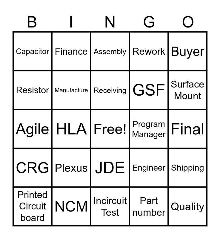 This bingo card has a free space and 24 words: Plexus, NCM, Receiving, Printed Circuit board, Buyer, Capacitor, Resistor, Finance, Program Manager, JDE, GSF, Agile, Engineer, Shipping, Manufacture, Part number, Final, Assembly, Surface Mount, HLA, Quality, CRG, Rework and Incircuit Test.