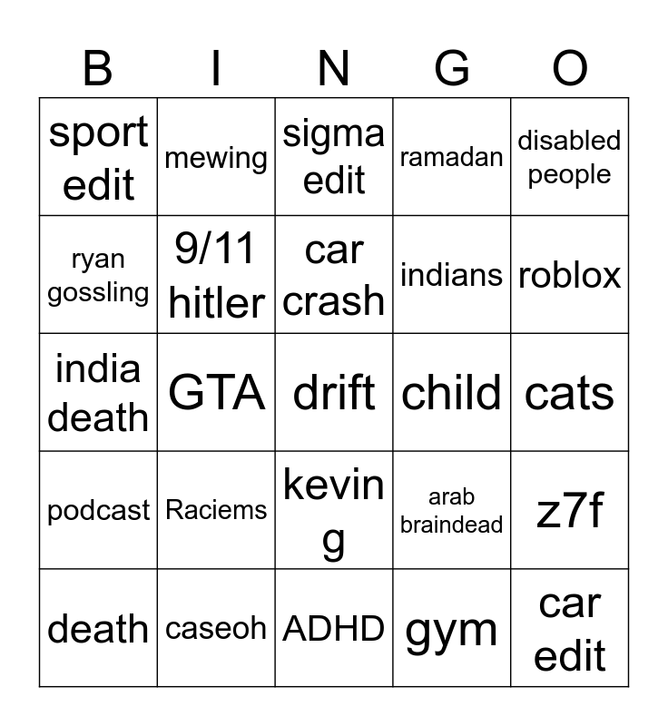 This bingo card has a free space and 24 words: Raciems, caseoh, car crash, death, disabled people, sport edit, ryan gossling, mewing, child, kevin g, indians, india death, arab braindead, z7f, 9/11 hitler, gym, cats, sigma edit, roblox, GTA, car edit, podcast, ramadan and ADHD.