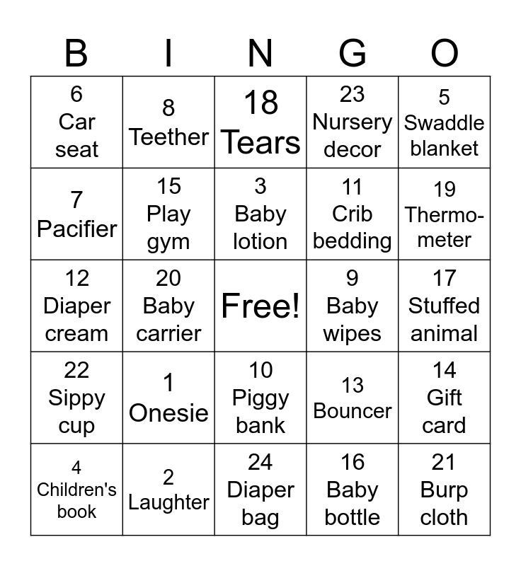 This bingo card has a free space and 24 words: 1 Onesie, 2 Laughter, 3 Baby lotion, 4 Children's book, 5 Swaddle blanket, 6 Car seat, 7 Pacifier, 8 Teether, 9 Baby wipes, 10 Piggy bank, 11 Crib bedding, 12 Diaper cream, 13 Bouncer, 14 Gift card, 15 Play gym, 16 Baby bottle, 17 Stuffed animal, 18 Tears, 19 Thermo-meter, 20 Baby carrier, 21 Burp cloth, 22 Sippy cup, 23 Nursery decor and 24 Diaper bag.