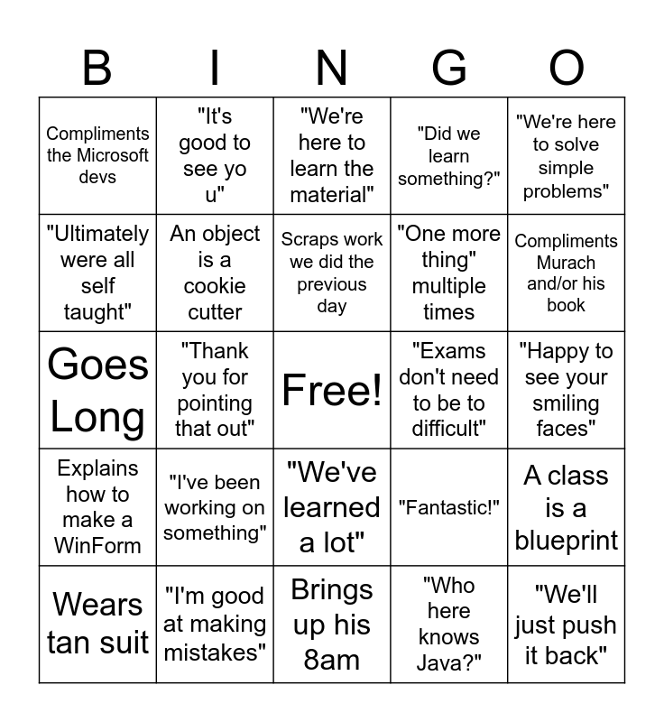 This bingo card has a free space and 24 words: "I've been working on something", "I'm good at making mistakes", Scraps work we did the previous day, Wears tan suit, "We're here to solve simple problems", Compliments the Microsoft devs, "Ultimately were all self taught", "It's good to see you", "Exams don't need to be to difficult", "We've learned a lot", "One more thing" multiple times, Goes Long, "Fantastic!", A class is a blueprint, An object is a cookie cutter, "Who here knows Java?", "Happy to see your smiling faces", "We're here to learn the material", Compliments Murach and/or his book, "Thank you for pointing that out", "We'll just push it back", Explains how to make a WinForm, "Did we learn something?" and Brings up his 8am.