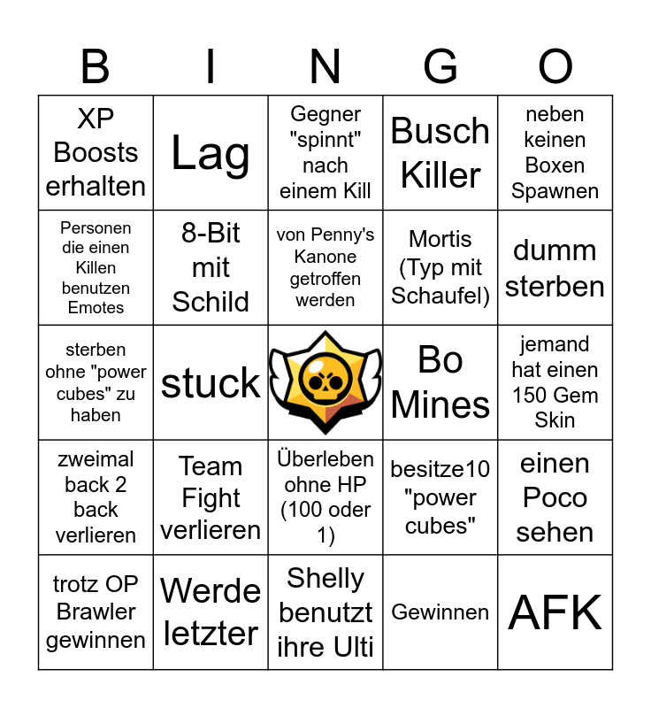 This bingo card has a free space and 24 words: Team Fight verlieren, Werde letzter, von Penny's Kanone getroffen werden, trotz OP Brawler gewinnen, neben keinen Boxen Spawnen, XP Boosts erhalten, Personen die einen Killen benutzen Emotes, Lag, Bo Mines, Überleben ohne HP (100 oder 1), Mortis (Typ mit Schaufel), sterben ohne "power cubes" zu haben, besitze10 "power cubes", einen Poco sehen, 8-Bit mit Schild, Gewinnen, jemand hat einen 150 Gem Skin, Gegner "spinnt" nach einem Kill, dumm sterben, stuck, AFK, zweimal back 2 back verlieren, Busch Killer and Shelly benutzt ihre Ulti.
