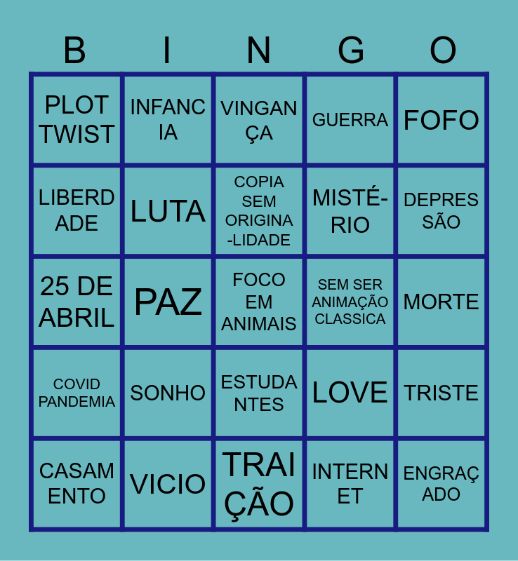 This bingo card has 25 words: SONHO, TRAI ÇÃO, COPIA SEM ORIGINA -LIDADE, CASAM ENTO, FOFO, PLOT TWIST, LIBERD ADE, INFANC IA, SEM SER ANIMAÇÃO CLASSICA, ESTUDA NTES, MISTÉ- RIO, 25 DE ABRIL, LOVE, TRISTE, LUTA, ENGRAÇ ADO, MORTE, VINGAN ÇA, DEPRES SÃO, PAZ, FOCO EM ANIMAIS, VICIO, COVID PANDEMIA, GUERRA and INTERN ET.