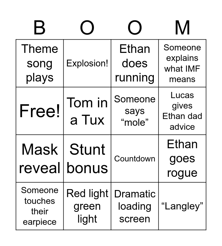 This bingo card has 16 words: Red light green light, Ethan goes rogue, Ethan does running, Theme song plays, Mask reveal, Explosion!, Countdown, Dramatic loading screen, Free!, Tom in a Tux, Someone touches their earpiece, Someone explains what IMF means, Stunt bonus, Lucas gives Ethan dad advice, Someone says “mole” and “Langley”.