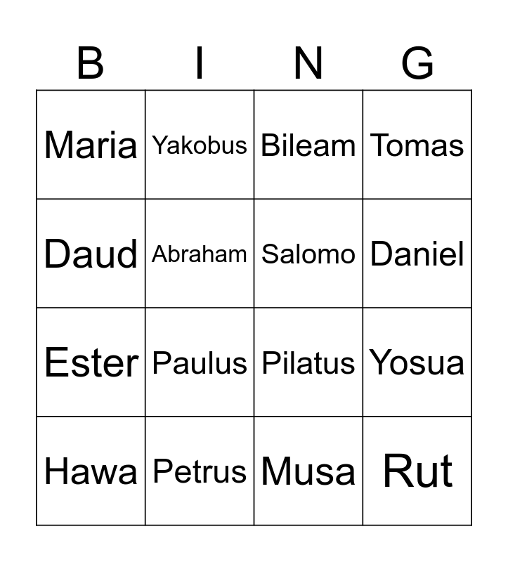 This bingo card has 16 words: Petrus, Yosua, Bileam, Maria, Ester, Yakobus, Pilatus, Musa, Daud, Abraham, Hawa, Tomas, Paulus, Daniel, Salomo and Rut.