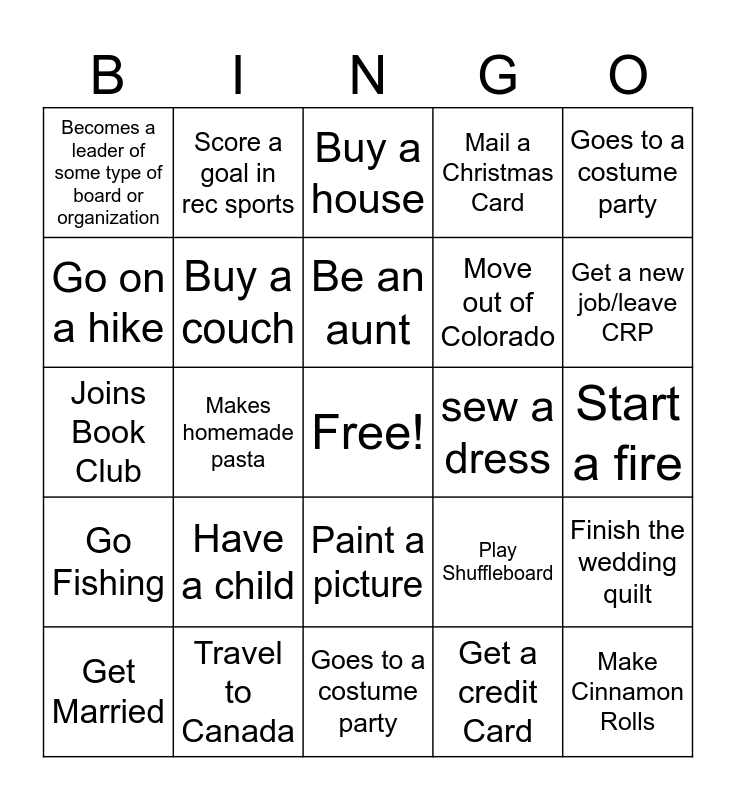 This bingo card has a free space and 25 words: Get Married, Have a child, Be an aunt, Get a credit Card, Get a new job/leave CRP, Becomes a leader of some type of board or organization, Score a goal in rec sports, Buy a house, Move out of Colorado, Finish the wedding quilt, Joins Book Club, Buy a couch, Play Shuffleboard, Make Cinnamon Rolls, Go on a hike, Travel to Canada, Goes to a costume party, Mail a Christmas Card, Start a fire, Go Fishing, Makes homemade pasta, Paint a picture, sew a dress, Goes to a costume party and order a pizza for delivery.