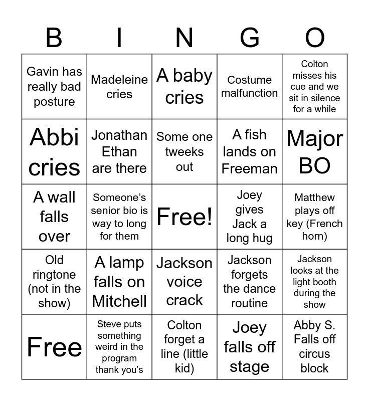 This bingo card has a free space and 27 words: Jackson forgets the dance routine, Mic pops, A fish lands on Freeman, Colton forget a line (little kid), Abbi cries, A baby cries, Madeleine cries, Old ringtone (not in the show), Joey gives Jack a long hug, Jackson looks at the light booth during the show, A wall falls over, Costume malfunction, Free, Steve puts something weird in the program thank you’s, Major BO, Missed audio cue, Jonathan Ethan are there, Some one tweeks out, A lamp falls on Mitchell, Gavin has really bad posture, Matthew plays off key (French horn), Joey falls off stage, Someone’s senior bio is way to long for them, Abby S. Falls off circus block, Jackson voice crack, Colton misses his cue and we sit in silence for a while and Jackson gets injured during the party.