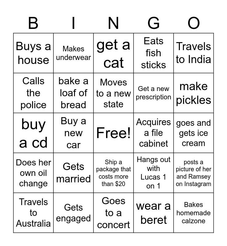 This bingo card has a free space and 24 words: Gets married, Gets engaged, Moves to a new state, Travels to Australia, Travels to India, Buys a house, Calls the police, Makes underwear, Acquires a file cabinet, Ship a package that costs more than $20, Get a new prescription, buy a cd, Hangs out with Lucas 1 on 1, posts a picture of her and Ramsey on Instagram, bake a loaf of bread, wear a beret, goes and gets ice cream, get a cat, make pickles, Buy a new car, Bakes homemade calzone, Does her own oil change, Eats fish sticks and Goes to a concert.