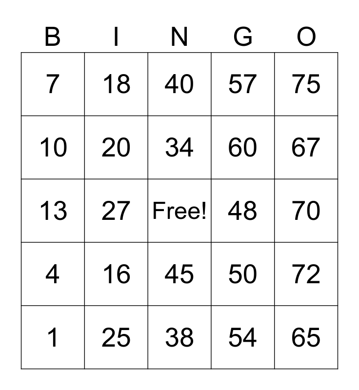 This bingo card has a free space and 24 words: 1, 16, 34, 54, 75, 7, 18, 40, 48, 70, 13, 20, 50, 72, 10, 25, 38, 57, 67, 4, 27, 45, 60 and 65.