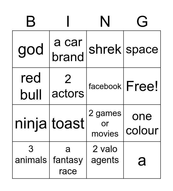 This bingo card has 17 words: 2 valo agents, 3 animals, shrek, god, toast, space, one colour, facebook, Free!, 2 actors, a fantasy race, 2 games or movies, red bull, a car brand, ninja, fish and a.