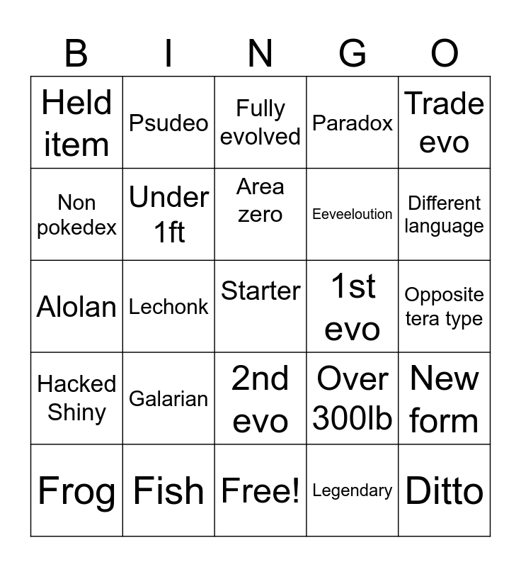 This bingo card has 25 words: Hacked Shiny, Fish, Starter, Legendary, Trade evo, Held item, Psudeo, Fully evolved, 1st evo, New form, Non pokedex, Under 1ft, Free!, Over 300lb, Different language, Frog, Lechonk, Area zero, Eeveeloution, Opposite tera type, Alolan, Galarian, 2nd evo, Paradox and Ditto.