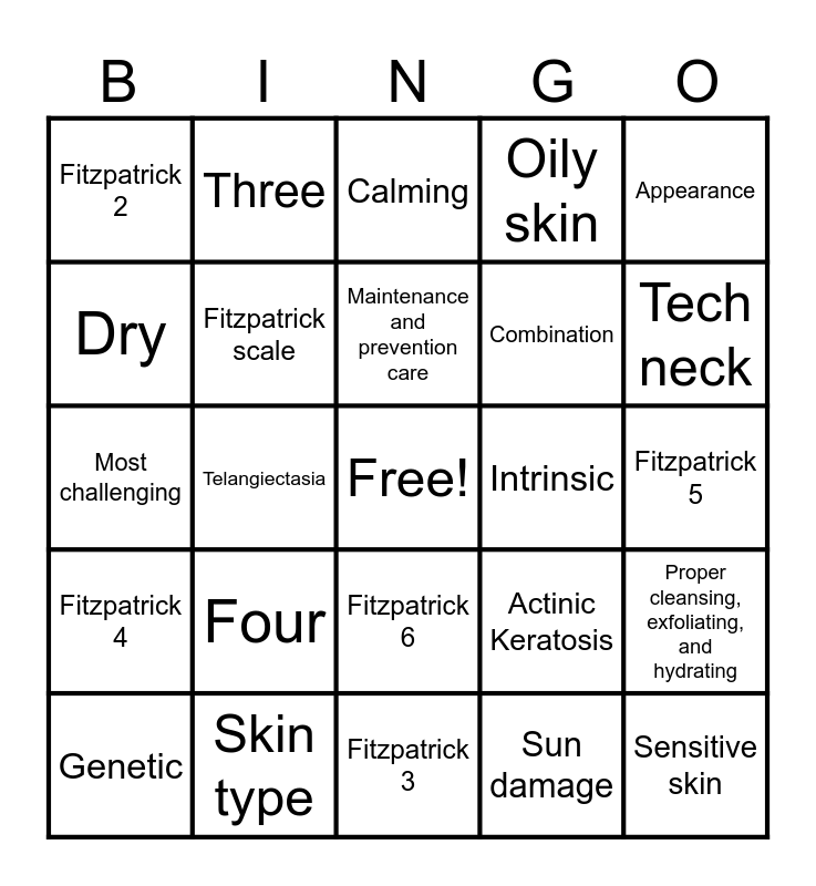 This bingo card has a free space and 24 words: Four, Skin type, Maintenance and prevention care, Genetic, Appearance, Fitzpatrick 2, Dry, Three, Intrinsic, Fitzpatrick 6, Combination, Most challenging, Actinic Keratosis, Proper cleansing, exfoliating, and hydrating, Fitzpatrick scale, Sun damage, Fitzpatrick 5, Calming, Tech neck, Telangiectasia, Sensitive skin, Fitzpatrick 4, Oily skin and Fitzpatrick 3.