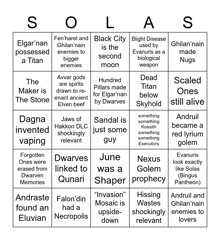 This bingo card has a free space and 24 words: Dwarves linked to Qunari, Falon’din had a Necropolis, Hundred Pillars made for Elgar’nan by Dwarves, Andraste found an Eluvian, Ghilan’nain made Nugs, Elgar’nan possessed a Titan, The Maker is The Stone, Fen’harel and Ghilan’nain enemies to bigger enemies, something something Kossith something something Executors, June was a Shaper, Dead Titan below Skyhold, Dagna invented vaping, Nexus Golem prophecy, Evanuris look exactly like Solas (Bingus Pantheon), Avvar gods are spirits drawn to re-enact ancient Elven beef, Hissing Wastes shockingly relevant, Andruil became a red lyrium golem, Black City is the second moon, Scaled Ones still alive, Jaws of Hakkon DLC shockingly relevant, Andruil and Ghilan’nain enemies to lovers, Forgotten Ones were erased from Dwarven Memories, Blight Disease used by Evanuris as a biological weapon and “Invasion” Mosaic is upside-down.