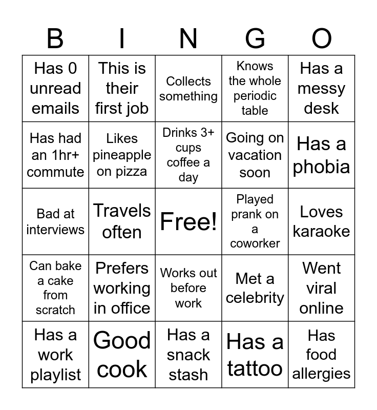 This bingo card has a free space and 25 words: Prefers working in office, Has a snack stash, Drinks 3+ cups coffee a day, Has a work playlist, Has a messy desk, Has 0 unread emails, Has had an 1hr+ commute, This is their first job, Played prank on a coworker, Works out before work, Going on vacation soon, Bad at interviews, Met a celebrity, Went viral online, Likes pineapple on pizza, Screams during scary movies, Loves karaoke, Collects something, Has a phobia, Travels often, Has food allergies, Good cook, Can bake a cake from scratch, Knows the whole periodic table and Has a tattoo.