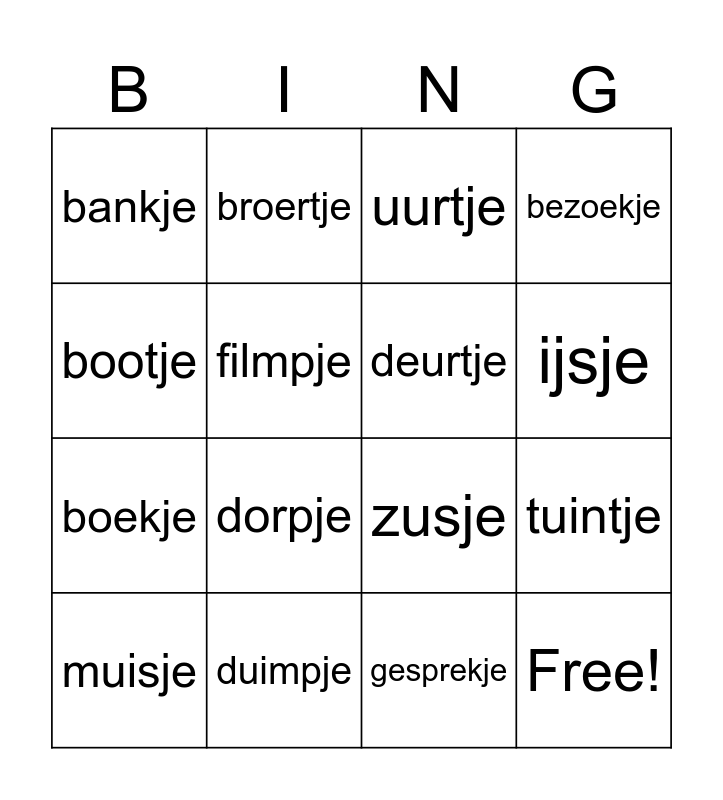 This bingo card has 23 words: Free!, kopje, ijsje, neefje, bootje, bankje, filmpje, broertje, muisje, petje, dorpje, boekje, zakje, gebakje, duimpje, poosje, uurtje, zusje, deurtje, tuintje, bezoekje, gesprekje and armpje.
