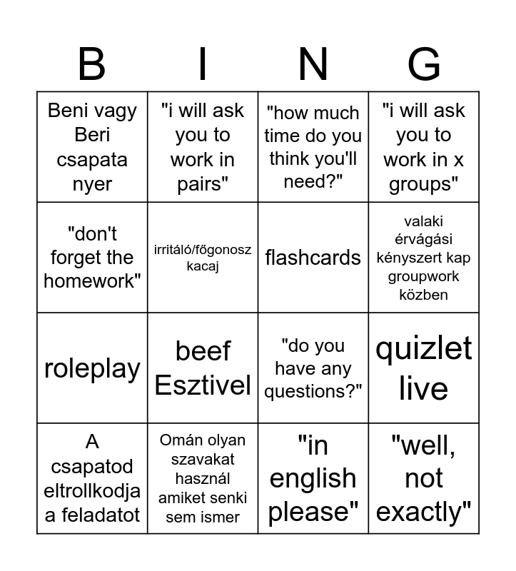 This bingo card has 16 words: Omán olyan szavakat használ amiket senki sem ismer, quizlet live, "how much time do you think you'll need?", Beni vagy Beri csapata nyer, roleplay, "i will ask you to work in pairs", "do you have any questions?", "in english please", "don't forget the homework", irritáló/főgonosz kacaj, A csapatod eltrollkodja a feladatot, "i will ask you to work in x groups", beef Esztivel, valaki érvágási kényszert kap groupwork közben, flashcards and "well, not exactly".