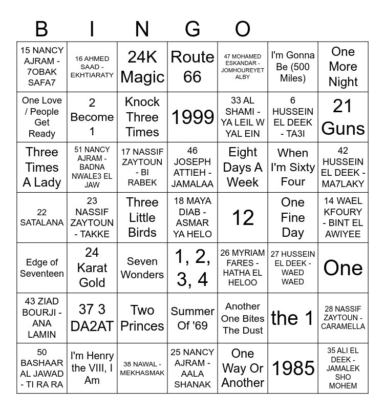 This bingo card has 106 words: Free!, I'm Henry the VIII, I Am, Knock Three Times, One More Night r, The 59th Street Bridge Song (Feelin' Groovy), 3AM, Sunny and 75, Nothing Compares 2 U, 7 Things, The One I Love, 80's Films, Be the One, the 1, Gimme Three Steps, 8675309 Jenny Jenny, 24 Karat Gold, 24K Magic, 100 Bottles of Beer On The Wall, 100 Years, I Can't Drive 55, 21 Guns, Two Out of Three Ain't Bad, Fifteen Beers, 25 or 6 to 4, Summer Of '69, Eight Days A Week, When I'm Sixty Four, One More Night, One Week, It Takes Two, Three Little Birds, 1, 2, 3, 4, 409, One Fine Day, One, Edge of Seventeen, 99 Red Balloons, 9 to 5, 1999, Another One Bites The Dust, 1985, 6 Foot 7 Foot, Three Times A Lady, 2 Become 1, Two Princes, Route 66, One Way Or Another, I'm Gonna Be (500 Miles), 1979, One Love / People Get Ready, 50 Ways to Leave Your Lover, Seven Wonders, Love Potion No. 9, My Next 30 Years, 1 FARAH CHRIEM - ALBY ELO, 2 AHMED SAAD - EL YOUM EL HELW DAH, 3 NANCY AJRAM - SAH SAH, 4 YA MNA3NA3, 5 EL GHAZALA RAY2A, 6 HUSSEIN EL DEEK - TA3I, 7 AL SHAMI - SABRAN, 8 NASSIF ZAYTOUN - KEL YOUM B7BK, 9 Kol Sana Wenty Tayeba Ya Mama, 10 FARES KARAM - AAL HADA, 11 AHMED SAAD - WASA3 WASA3, 12, 13 HUSSEIN EL DEEK - SAWA SAWA, 14 WAEL KFOURY - BINT EL AWIYEE, 15 NANCY AJRAM - 7OBAK SAFA7, 16 AHMED SAAD - EKHTIARATY, 17 NASSIF ZAYTOUN - BI RABEK, 18 MAYA DIAB - ASMAR YA HELO, 19 SAIF NABEEL - AH YANI, 20 LAMIS KAN - MESAYTARA, 21 FARES KARAM - NESSWANJE, 22 SATALANA, 23 NASSIF ZAYTOUN - TAKKE, 24 MOHAMED EL MAJZOUB - EL HOB EL HOB, 25 NANCY AJRAM - AALA SHANAK, 26 MYRIAM FARES - HATHA EL HELOO, 27 HUSSEIN EL DEEK - WAED WAED, 28 NASSIF ZAYTOUN - CARAMELLA, 29 JOSEPH ATTIEH - OMAR ASAL, 30 FARES KARAM - ELY BYEKZOB 3A MARTO, 31 ZEF- EL BEKLE, 32, 33 AL SHAMI - YA LEIL W YAL EIN, 34, 35 ALI EL DEEK - JAMALEK SHO MOHEM, 36 NASSIF ZAYTOUN - HOB JNOUN, 37 3 DA2AT, 38 NAWAL - MEKHASMAK, 39 MELHEM ZAIN - DALLE D7AKY, 40 HAZEEM - JAMALA WLOOO, 41 NANCY AJRAM - TEGY NENBESET, 42 HUSSEIN EL DEEK - MA7LAKY, 43 ZIAD BOURJI - ANA LAMIN, 44 SELENA GOMEZ - CALM DOWN, 45 SETT EL HABAYEB, 46 JOSEPH ATTIEH - JAMALAA, 47 MOHAMED ESKANDAR - JOMHOUREYET ALBY, 48 FARES KARAM - BEDNA NWALLE3A, 49 DESPACITO, 50 BASHAAR AL JAWAD - TI RA RA, 51 NANCY AJRAM - BADNA NWALE3 EL JAW and 52 EL3AB YALLA.