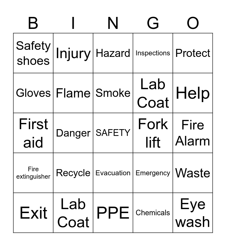 This bingo card has a free space and 24 words: Recycle, Lab Coat, Smoke, Exit, Protect, Safety shoes, Gloves, Injury, Fork lift, Evacuation, Lab Coat, First aid, Emergency, Waste, Flame, Chemicals, Fire Alarm, Hazard, Help, Danger, Eye wash, Fire extinguisher, Inspections and PPE.