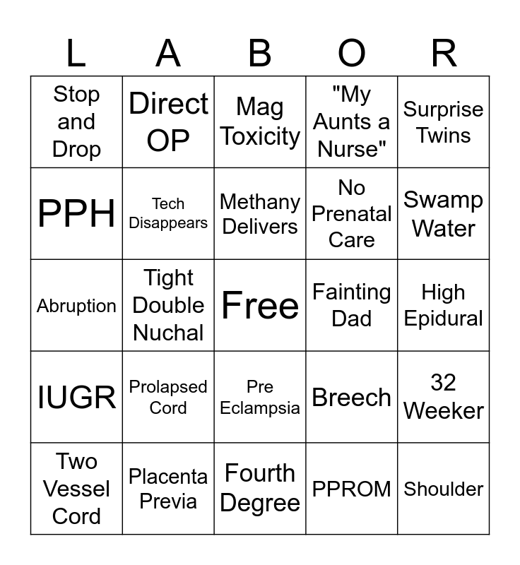 This bingo card has a free space and 24 words: Prolapsed Cord, Placenta Previa, Methany Delivers, Two Vessel Cord, Surprise Twins, Stop and Drop, PPH, Direct OP, Fainting Dad, Pre Eclampsia, No Prenatal Care, Abruption, Breech, 32 Weeker, Tech Disappears, PPROM, High Epidural, Mag Toxicity, Swamp Water, Tight Double Nuchal, Shoulder, IUGR, "My Aunts a Nurse" and Fourth Degree.