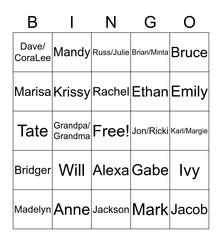 This bingo card has a free space and 24 words: Will, Anne, Rachel, Madelyn, Bruce, Dave/ CoraLee, Marisa, Mandy, Jon/Ricki, Alexa, Ethan, Tate, Gabe, Ivy, Krissy, Mark, Karl/Margie, Russ/Julie, Emily, Grandpa/ Grandma, Jacob, Bridger, Brian/Minta and Jackson.
