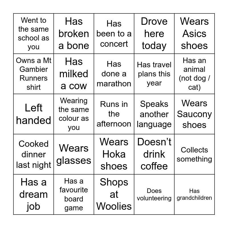 This bingo card has 64 words: Free!, Same birth month as you, Owns same car brand as you, Collects something, Has a phobia, Has a nickname, Has broken a bone, Has a New Year's resolution, Has done a marathon, Got a PB at parkrun this year, Wears Hoka shoes, Wears Brooks shoes, Wears Saucony shoes, Wears Asics shoes, Wears On Cloud shoes, Owns a Mt Gambier Runners shirt, Wearing the same colour as you, Went to the same school as you, Student or retired, Has travel plans this year, Wears glasses, Cooked dinner last night, Drove here today, Has the same surname as you, Has been inside Centenary Tower, Prefers trails over road running, Prefers road over trail running, Has lived overseas, Owns more than one car, Has bought a drink tonight, Has coached on Thursday, Has seen a snake in the past 3 months, Has done 200 or more parkruns, Can play a musical instrument, Has an animal (not dog / cat), Has a dream job, Grows vegetables, Does volunteering, Doesn’t have Facebook, Has milked a cow, Left handed, Speaks another language, Has a celebrity autograph, Is reading a book, Runs in the morning, Runs in the afternoon, Has a favourite board game, Has grandchildren, Doesn’t drink coffee, Has a favourite meal at Metro, Can tell you a joke out of the blue, Shops at Coles, Shops at Woolies, Went to parkrun today, Played with Play-Doh, Has freckles, Has been to a concert, Likes broccoli, Has a hidden talent, Can tell you their favourite song, Can tell you their favourite movie, Has gone to a concert, Has been bungee jumping and Has done less than 200 parkruns.
