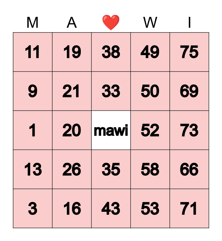 This bingo card has a free space and 24 words: 3, 26, 33, 53, 75, 11, 19, 38, 52, 73, 1, 21, 58, 66, 9, 16, 43, 49, 69, 13, 20, 35, 50 and 71.