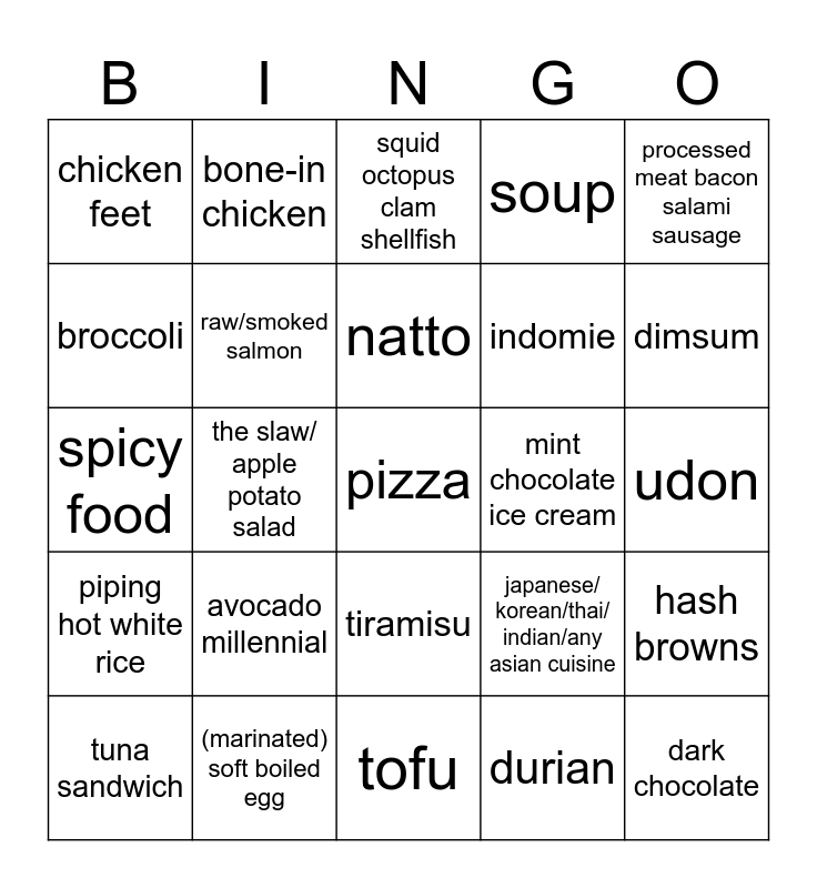 This bingo card has a free space and 24 words: avocado millennial, (marinated) soft boiled egg, natto, tuna sandwich, processed meat bacon salami sausage, chicken feet, broccoli, bone-in chicken, mint chocolate ice cream, tiramisu, indomie, spicy food, japanese/ korean/thai/ indian/any asian cuisine, hash browns, raw/smoked salmon, durian, udon, squid octopus clam shellfish, dimsum, the slaw/ apple potato salad, dark chocolate, piping hot white rice, soup and tofu.