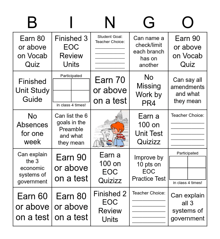 This bingo card has 2 images, a free space and 24 words: Earn 90 or above on a test, Earn 80 or above on a test, Earn 70 or above on a test, Earn 60 or above on a test, Earn 90 or above on Vocab Quiz, Earn 80 or above on Vocab Quiz, Finished Unit Study Guide, Finished 3 EOC Review Units, Earn a 100 on Unit Test Quizizz, Earn a 100 on EOC Quizizz, No Missing Work by PR4, No Absences for one week, Improve by 10 pts on EOC Practice Test, Participated in class 4 times!, Participated in class 4 times!, Teacher Choice: _____________ _____________ _____________ _____________ _____________, Teacher Choice: _____________ _____________ _____________ _____________ _____________, Student Goal: Teacher Choice: _____________ _____________ _____________ _____________ _____________, Can say all amendments and what they mean, Can list the 6 goals in the Preamble and what they mean, Can explain all 3 systems of government, Can explain the 3 economic systems of government, Can name a check/limit each branch has on another and Finished 2 EOC Review Units.