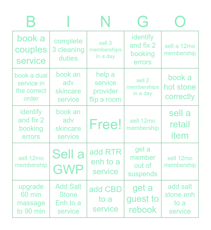 This bingo card has a free space and 24 words: Sell a GWP, Add Salt Stone Enh to a service, help a service provider flip a room, upgrade 60 min massage to 90 min, sell a 12mo membership, book a couples service, book a dual service in the correct order, complete 3 cleaning duties, sell 12mo membership, add RTR enh to a service, sell 2 memberships in a day, identify and fix 2 booking errors, get a member out of suspends, sell 12mo membership, book an adv skincare service, get a guest to rebook, sell a retail item, sell 3 memberships in a day, book a hot stone correctly, book an adv skincare service, add salt stone enh to a service, sell 12mo membership, identify and fix 2 booking errors and add CBD to a service.