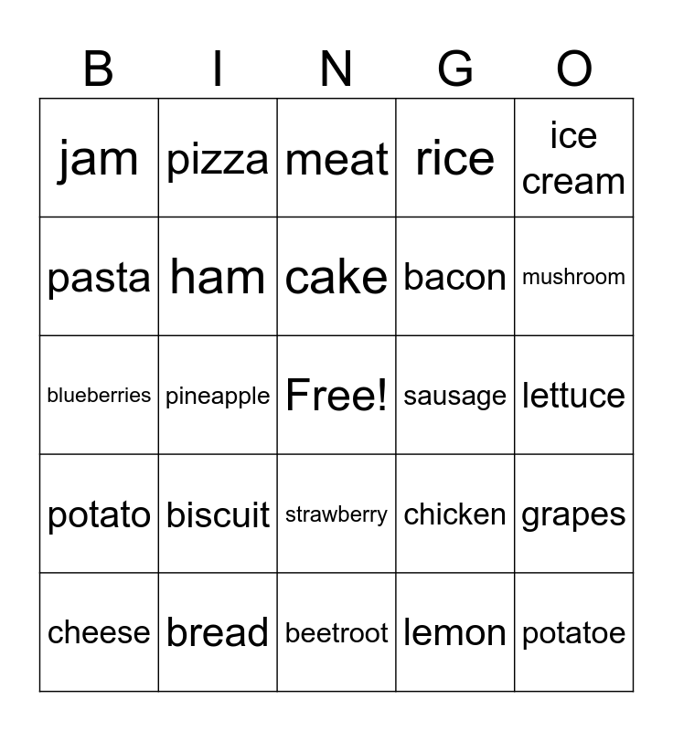 This bingo card has a free space and 24 words: biscuit, bread, cake, cheese, ice cream, jam, pasta, pizza, sausage, strawberry, bacon, blueberries, chicken, grapes, ham, lemon, lettuce, meat, mushroom, pineapple, potatoe, potato, rice and beetroot.